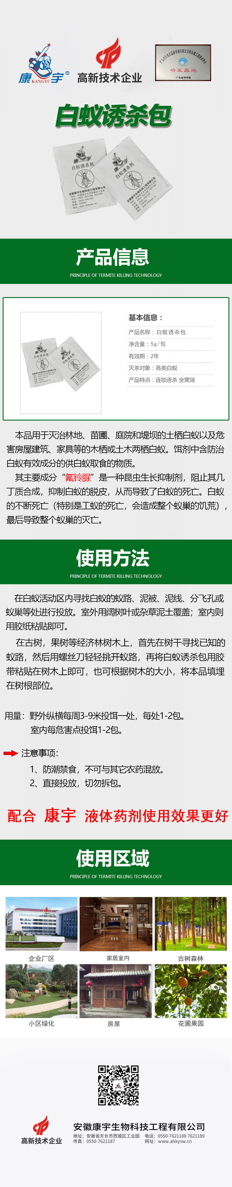 用于滅治林地、苗圃、庭院和水庫(kù)、堤壩的土棲白蟻以及危害房屋建筑、家具等的木棲或土木兩棲白蟻。