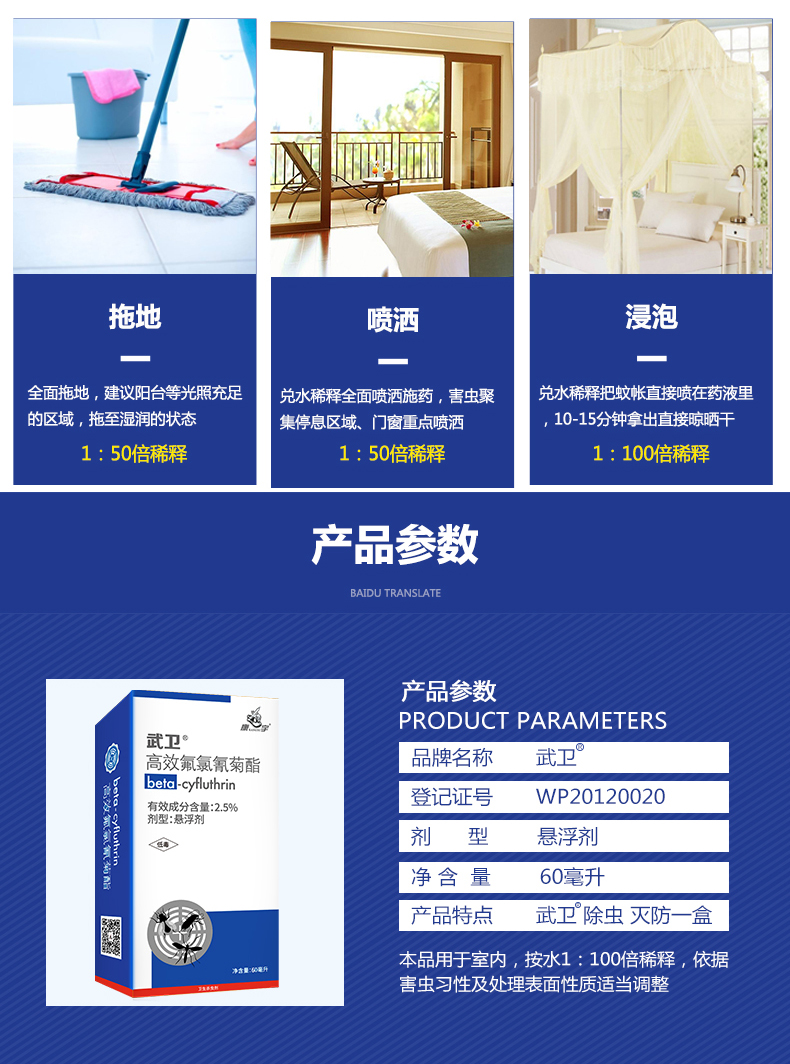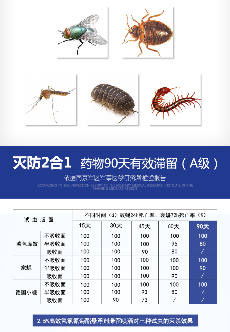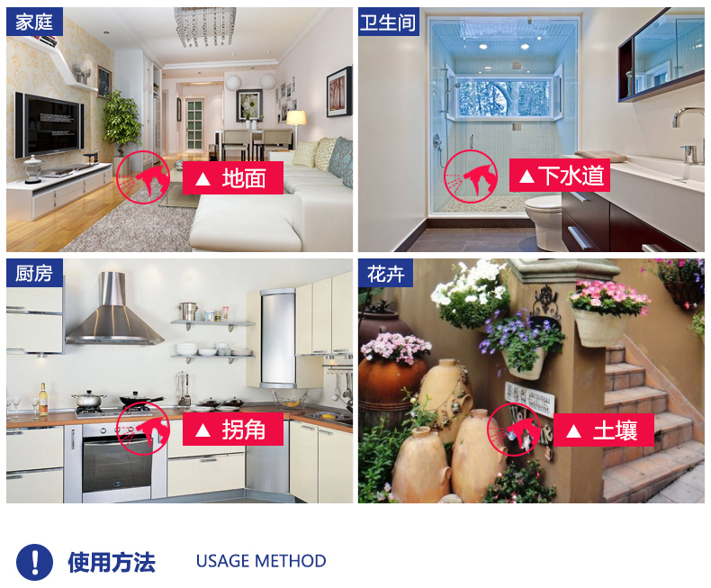 本品用于賓館、飯店、寫字樓、學校、工廠、公園、醫院、家庭等場所進行滯留噴灑,防治蟑螂、蒼蠅、蚊子衛生害蟲。