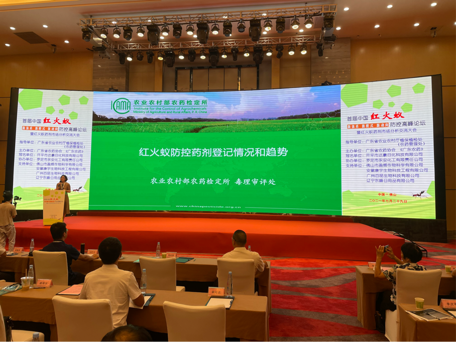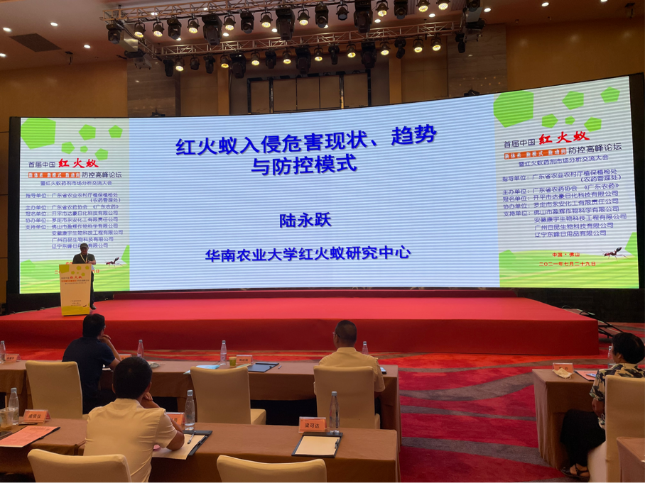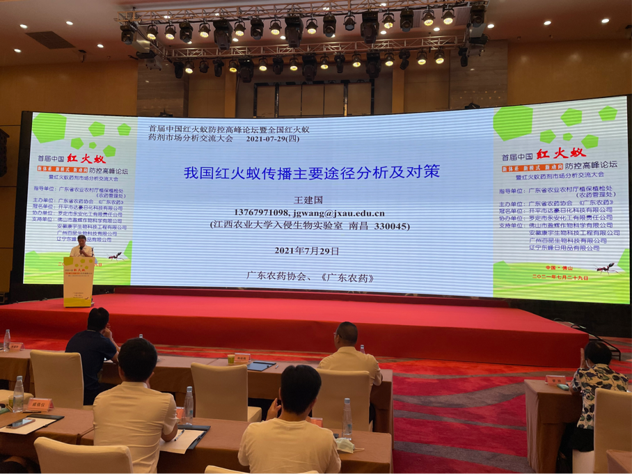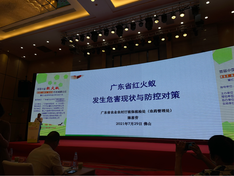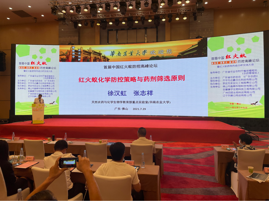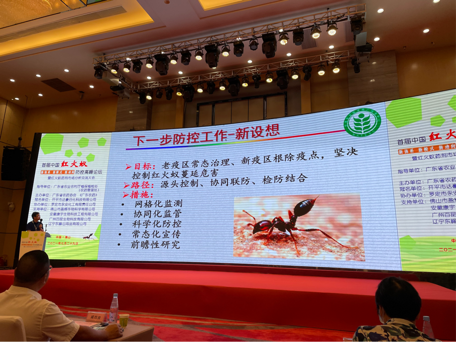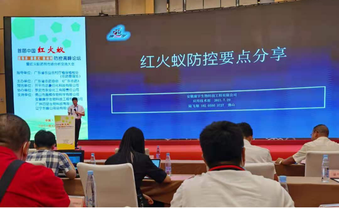 由廣東省農業農村廳指導,廣東省農藥協會、《廣東農藥》主辦,安徽康宇生物科技工程有限公司及相關企業、科研單位支持的首屆中國紅火蟻防控高峰論壇暨紅火蟻藥劑市場分析交流大會于2021年7月29日在龍舟競速、龍獅起舞的文化名城佛山成功舉辦。